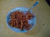 油茶是川渝两地的经典早点之一。其以大米为主料,将磨碎的大米筛成条状油炸,搭配米糊垫底而成。上层成色亮黄的油炸米条又称“馓(sǎn)子”,味道香脆,口感酥韧。米糊通常与牛油、辣椒、花椒、胡椒、黄豆及花生搅拌而成,粘稠鲜亮、气香味馥。食用时将馓子浸在米糊中搅拌泡软,连同米糊入口,滋味最佳。由于油茶味道浓烈且相对油腻,初次尝试建议佐配银耳汤、豆浆进食,以减轻油腻感。